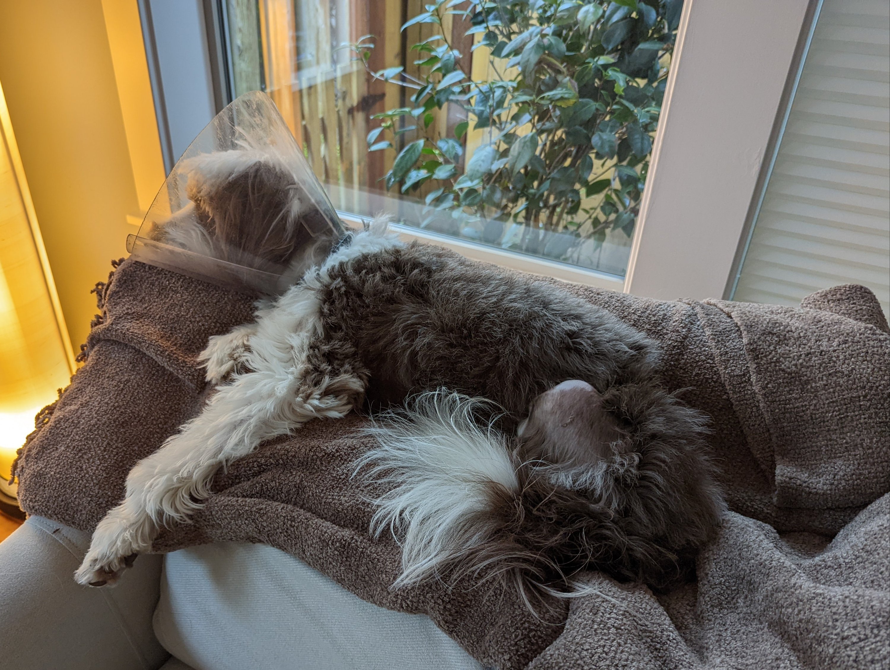 She is still wearing a cone to prevent her chewing the stitches on her belly.
